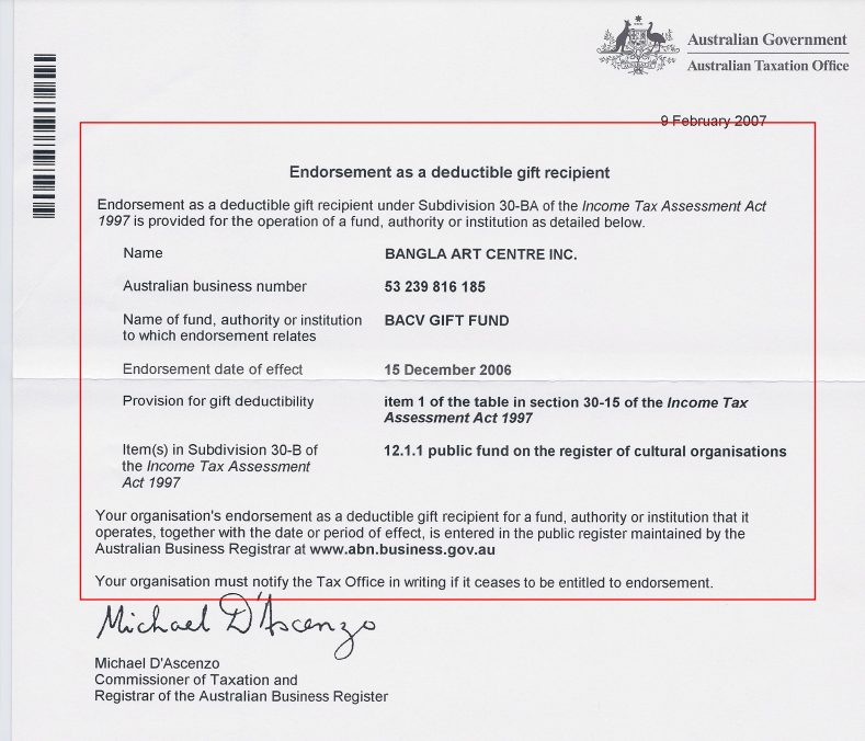 The organization holds a Deductible Gift Recipient (DGR) endorsement, allowing it to receive tax-deductible donations. This endorsement ensures that contributions made to the organization’s dedicated fund are recognized for their cultural and community value.