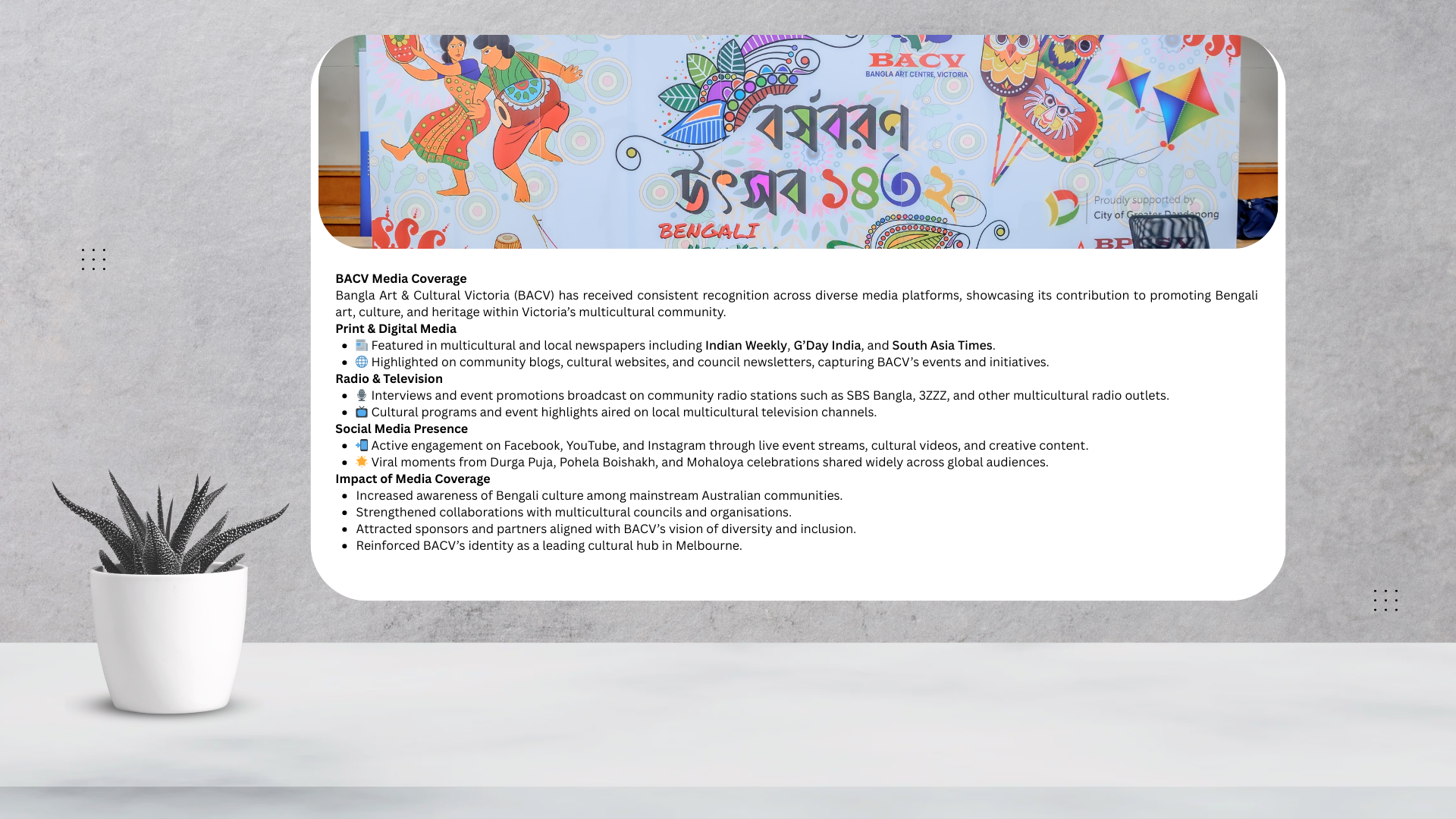 BACV Media Coverage Bangla Art & Cultural Victoria (BACV) has received consistent recognition across diverse media platforms, showcasing its contribution to promoting Bengali art, culture, and heritage within Victoria’s multicultural community. Print & Digital Media 📰 Featured in multicultural and local newspapers including Indian Weekly, G’Day India, and South Asia Times. 🌐 Highlighted on community blogs, cultural websites, and council newsletters, capturing BACV’s events and initiatives. Radio & Television 🎙️ Interviews and event promotions broadcast on community radio stations such as SBS Bangla, 3ZZZ, and other multicultural radio outlets. 📺 Cultural programs and event highlights aired on local multicultural television channels. Social Media Presence 📲 Active engagement on Facebook, YouTube, and Instagram through live event streams, cultural videos, and creative content. 🌟 Viral moments from Durga Puja, Pohela Boishakh, and Mohaloya celebrations shared widely across global audiences. Impact of Media Coverage Increased awareness of Bengali culture among mainstream Australian communities. Strengthened collaborations with multicultural councils and organisations. Attracted sponsors and partners aligned with BACV’s vision of diversity and inclusion. Reinforced BACV’s identity as a leading cultural hub in Melbourne.